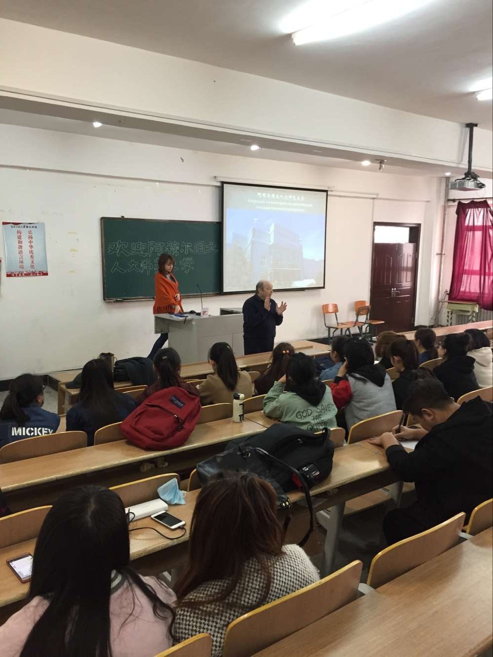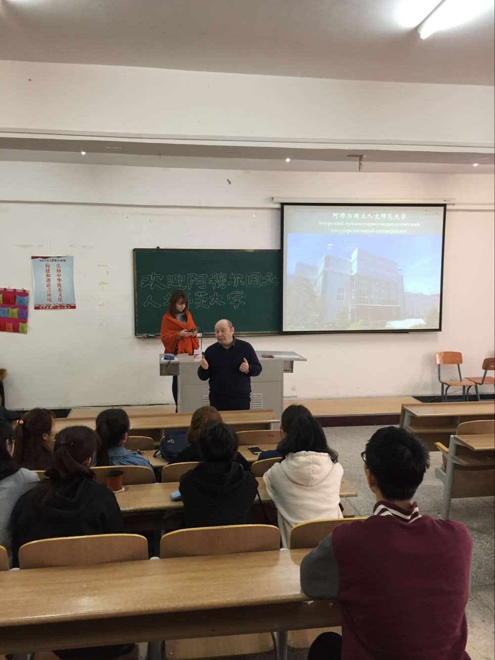 讲座伊始,我系教师与同学们对来访客人表示热烈欢迎。副校长科什金详细介绍了阿穆尔国立人文师范大学近年来的发展情况、师资基础与学生结构,并通过多媒体形式让同学们更深刻的感受和了解阿穆尔国立人文师范大学,领略异国文化和教育。最后,佳林娜老师针对视频内容与同学们亲切互动,大家也运用自己的俄语知识积极踊跃回答问题,大胆展示口语,不少同学得到了佳林娜老师从俄罗斯带来的小礼物。
