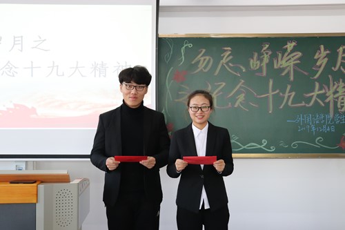 新思想引领新时代,新时代呼唤新作为。为更好的贯彻学习十九大精神,让我院学生深刻领会十九大精神的内涵,12月4日下午三点,由外国语学院分团委组织部主办的“勿忘峥嵘岁月之纪念十九大精神”主题党日活动于综合楼1214教室举行。莅临本次活动的嘉宾有16级辅导员陈政妤老师、组织部部长牛佳琪以及19级学生代表。