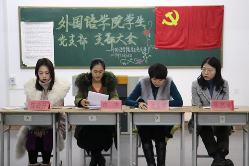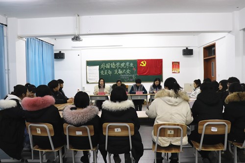 为壮大学生党支部的力量,吸收新鲜血液,外国语学院学生党支部于2019年12月18日下午3点40分在1202教室召开党支部大会。参加本次大会的人员有支部书记申杰、2017级辅导员沈春晖同志、2016级辅导员陈政妤同志、2019级辅导员孙艺萌同志、正式党员、预备党员以及党员发展对象。