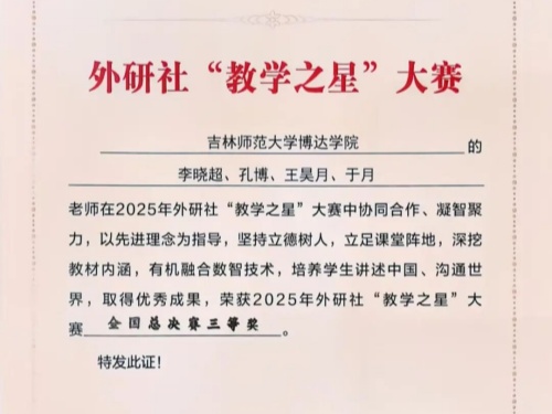 2025年外研社"教学之星"大赛("理解当代中国"英语类专业组)全国复赛传来捷报,吉林师范大学博达学院外国语学院团队凭借出色表现,勇夺全国复赛特等奖,成功晋级全国总决赛。本届大赛以"外语教材的有效使用:讲述中国,沟通世界"为主题,吸引了全国众多高校参赛队伍同台竞技。让我们向获奖团队表示热烈祝贺,期待他们在接下来的全国半决赛中再接再厉,再创辉煌!