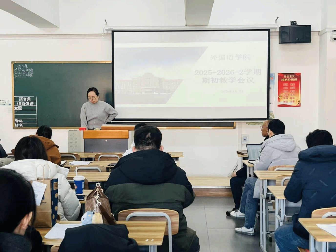 为精准统筹新学期教学工作,确保教学秩序平稳开展、教学质量稳步提升,2026年3月4日,外国语学院在综合楼1218召开 2025-2026-2 学期期初教学会议。学院全体教师参会,会议由教学院长金锦姬主持,院长矫福军就新学期重点工作作出部署。