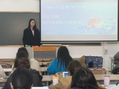 研讨会上,各语种专业教师结合一线教学实践,分享 AI 工具在外语口语教学中的应用经验、实操方法与优化建议。英语专业王雨涵老师介绍,自主开发口语小程序能够有效辅助学生开展自主口语训练;德语专业马跃老师分享了德语助手、豆包、DeepSeek 等工具的课堂应用心得,并就提升学生课堂专注度提出改进思路。