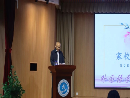 外国语学院院长矫福军向家长介绍了学院的办学理念、学科优势与培养规划,重点阐述了多语种教学和跨文化育人特色,以及为2025级新生制定的长远支持体系,旨在建立家长对学院的信任。他强调,中学到大学是重大转折期,学生需注重培养自主学习、自我管理和独立处事能力,建议家长多关注子女心理状态,鼓励并理性尊重其专业选择,共同助力顺利过渡。
