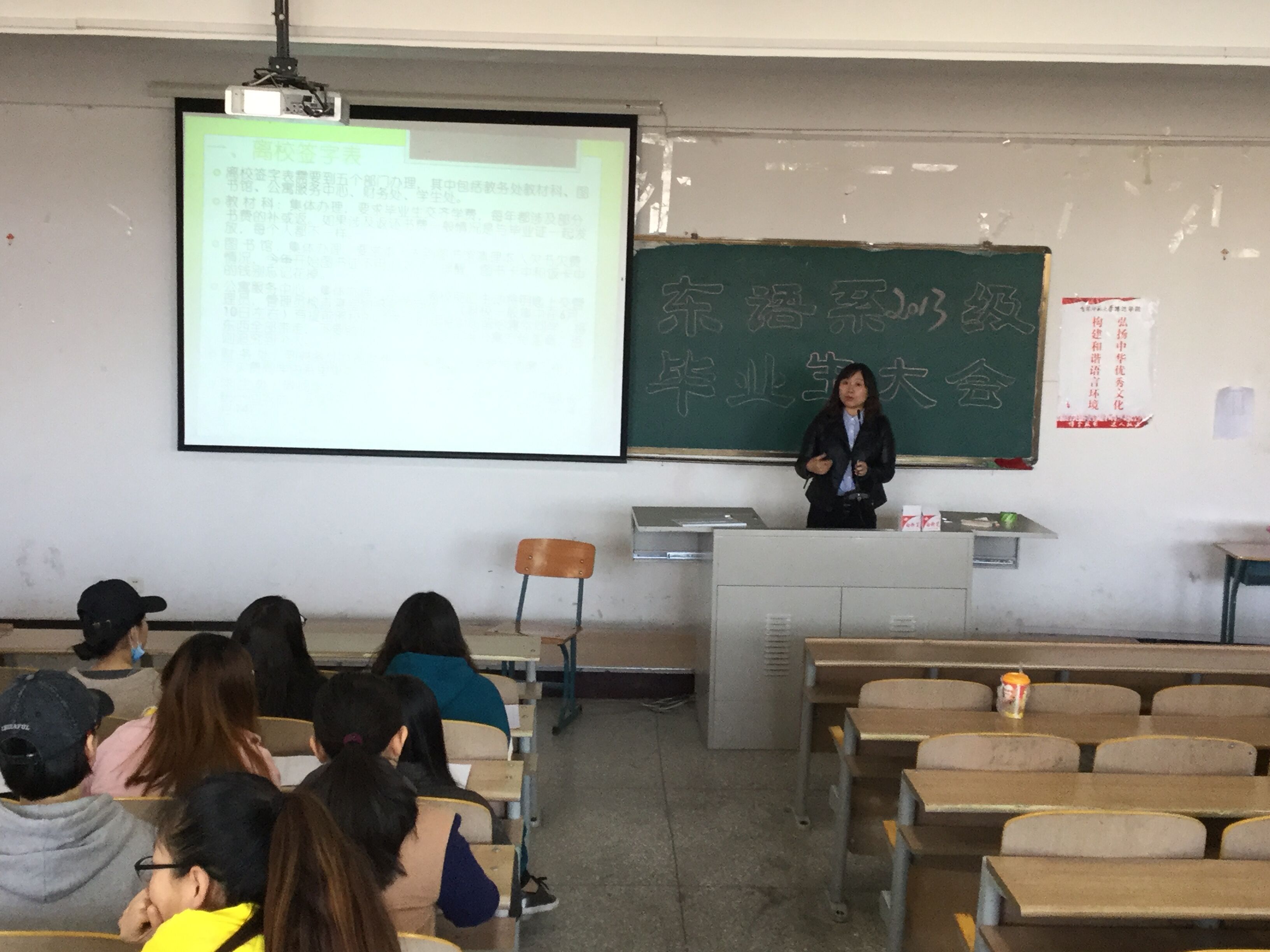 首先,为确保东语系毕业生工作顺利完成,东语系学工办于2017年4月12日上午10:00在三教221教室举办2017届全体毕业生大会。学工办主任崔婷婷老师主持大会。会议内容包括:离校手续的办理、毕业生登记表的填写、二学历毕业生登记表回收、教师资格证的办理材料、就业协议和派遣工作的解读、档案邮寄地址的填写、户口迁移的统计、党员组织关系转递、大学期间档案要件、毕业材料领取的注意事项等。崔老师针对上述内容进行详细讲解和答疑。同学们认真听取并记录。会议最后,崔老师对毕业生四年来对母校的贡献给予肯定,并对毕业生提出殷切希望,希望毕业生能够珍惜最后的校园时光和师生情谊,可以对母校的发展和建设、学生工作提出意见或建议;为学弟学妹们留下鼓励寄语;拍摄眼中最美的校园或者留下毕业前的心语等,同时,崔老师也表达了自己对毕业生的美好祝愿,祝愿毕业生在新的起点上能够前程似锦、大展宏图。最后,大会在老师一句“常回家看看”中感动落幕。