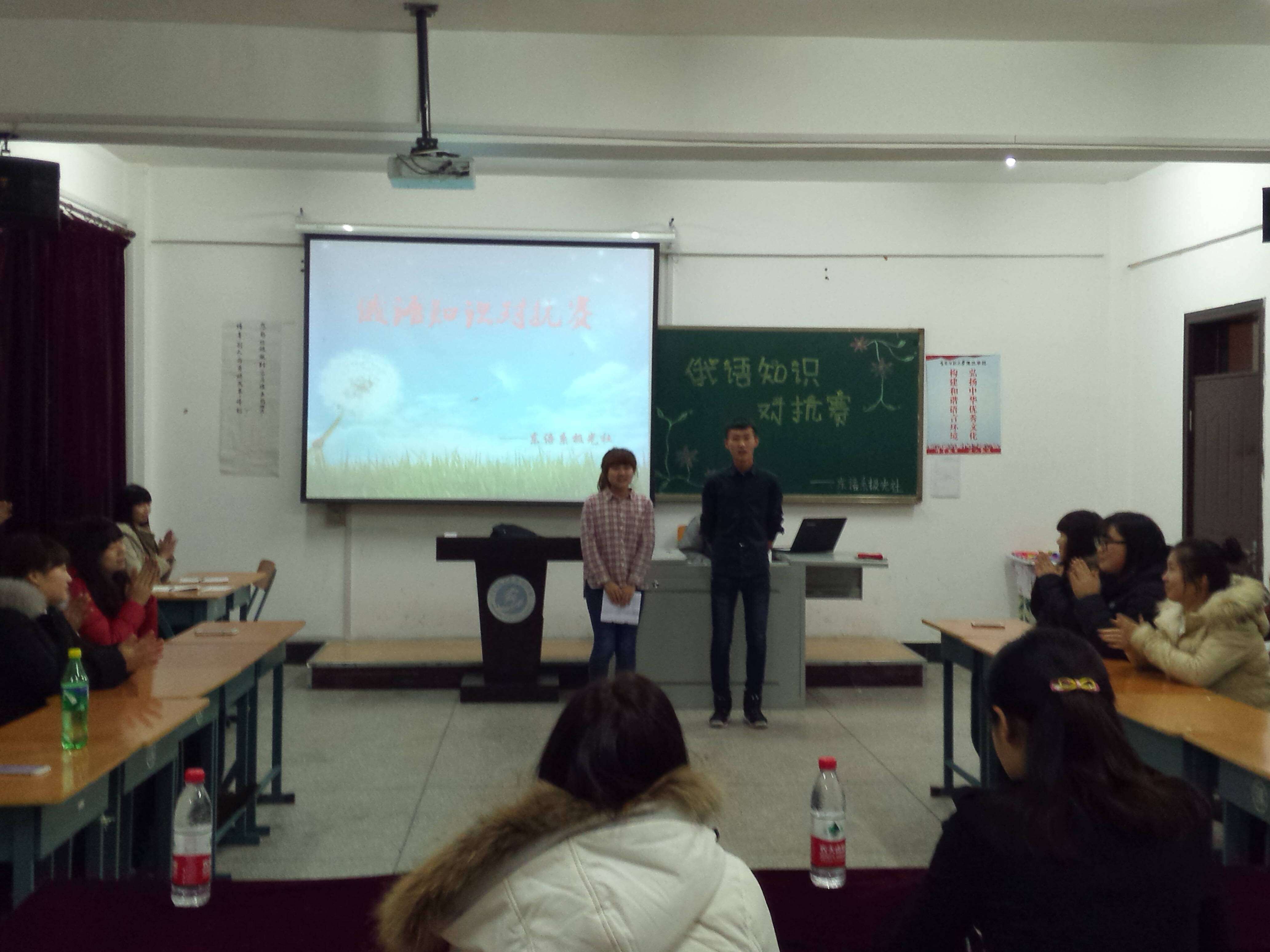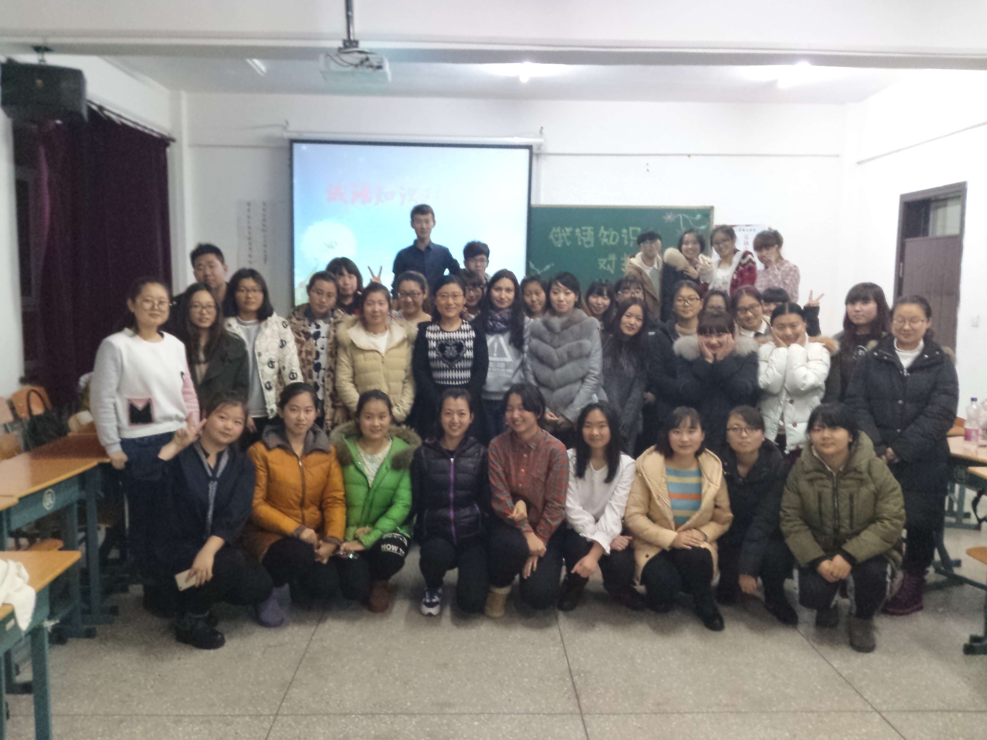 东语系俄语专业社团极光社于2015年12月3日晚6:30在3214教室举办了“俄语知识对抗赛”。陈宇老师、外教伊琳娜老师应邀到场,俄语专业的全体同学参加了本次活动。此次活动共分为三大部分。一、看图写单词,由双方派出代表在规定时间内写出看到的事物的俄语翻译。二、灵巧应答,由各组同学共同协商完成所缺单词的短语。三、你问我知多少,由同学们自由组队以抢凳子回答问题的方式,答出对俄罗斯国情的了解。在激烈的比赛之后,现场气氛持续高涨,同学们进行“一毛钱在哪里”“你来表演我来猜”两项游戏,此游戏不仅将现场气氛推向高潮,也加深了老师与同学之间的友谊。最后,陈宇老师对此次活动进行总结,陈宇老师再次强调学习好专业知识的重要性,并对全体同学在知识对抗赛的精彩表现提出表扬,希望全体同学在以后的学习中努力攀登,再创辉煌。