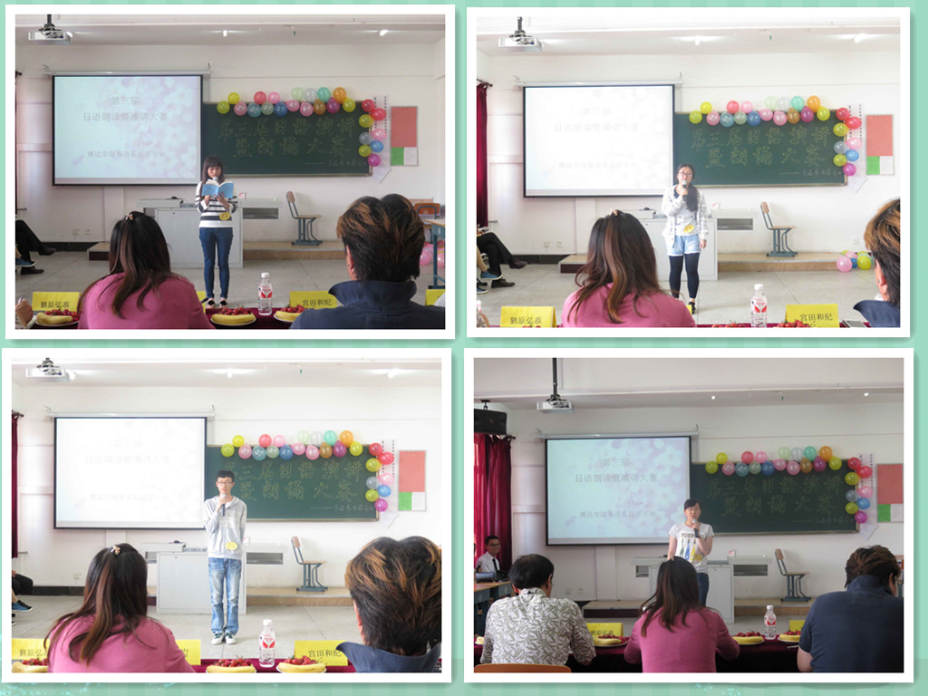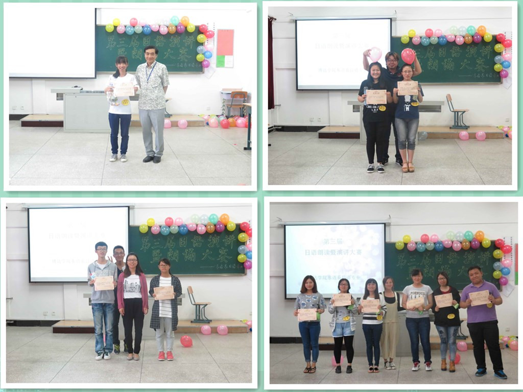 本次比赛共分为三个部分:第一环节,选手脱稿朗诵自选内容;第二环节,选手随机抽题朗诵;第三环节,选手随机抽题进行即兴演讲。参加比赛的十二名选手经过充分的准备,在赛场上谈吐言行充满自信,意气风发,流利的口语得到了现场观众的热烈掌声。赛途中,还加入了日语歌曲演唱与舞蹈表演,将现场气氛推向了高潮。最终,钱苗苗同学获得一等奖,阮萌、焦洁同学获得二等奖,姚善贤、姚晓东、黄凯铭同学获三等奖。至此,“第三届日语朗诵暨演讲大赛”圆满落下帷幕。